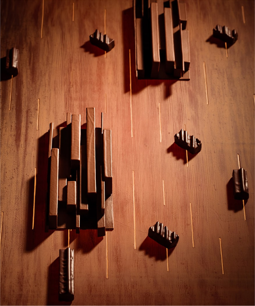 通过并列叠加、具有层次感的设计以及嵌入造型,我们用简单的几何结构创造出神奇的艺术作品。我们的甜品师为这款巧克力棒选择了长方形和梅花状的布局,呈现出纯粹的建筑学几何美感。