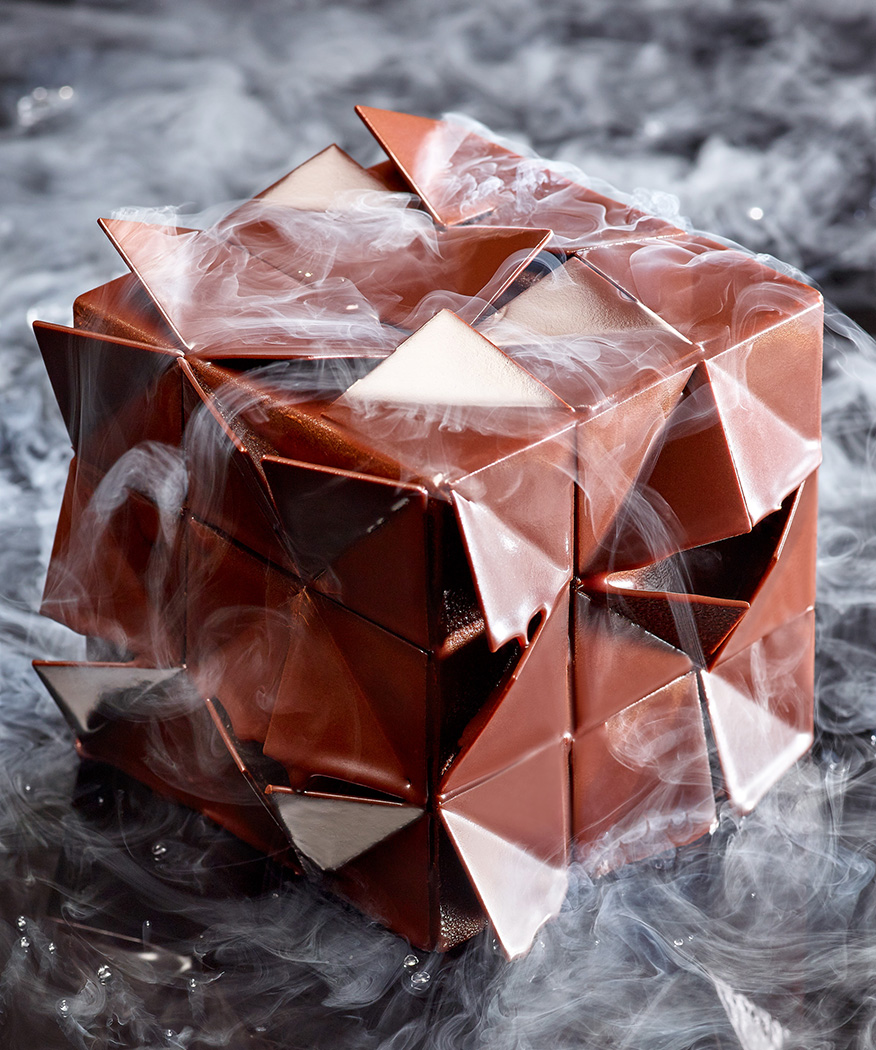 探索装饰这款甜点的折叠小方块背后简单而新颖的技巧:将预结晶的黑巧克力涂抹在一张卡片上,然后用刀切成方块并轻轻折叠。这就可以完美呈现出一个折纸方块的错觉。