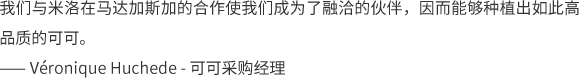 在马达加斯加北部,桑比拉诺河从高地流下,形成了肥沃的冲积平原。信风吹过这片小小的乐土,为可可树带来了生长所需的水分。经过数十年的培育,可可树已经完全适应了这里独特的环境。1900年左右,第一批可可树被引入马达加斯加桑比拉诺河流域的安巴尼亚地区。在曼特尼大获成功之后,2002年,法芙娜推出了一款名为“塔纳里瓦”的牛奶调温巧克力 – 法芙娜的第一款单一原产地牛奶巧克力。这款由优质可可豆制成的新产品对上等可可豆有了更高的要求。我们与过去的合作伙伴建立了更牢固的关系,以促进当地优质可可的生产。