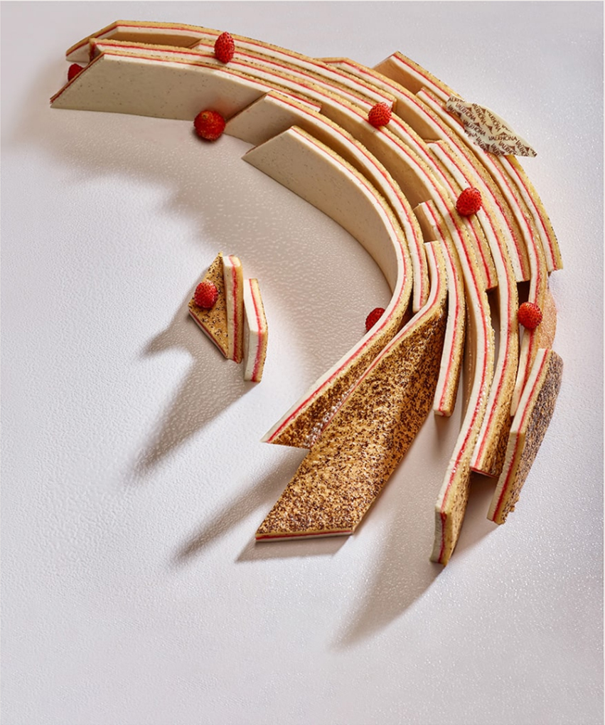 就如同建筑设计一样,层次能突出造型,反过来创造出深度,提供一种韵律和动感,同时在材质上产生反差之美。甜品制作亦然。叠层、甜品薄片的创意以及折叠效果赋予产品全新的维度、轻盈和质感。因此,我们的作品拥有酥脆的外观,让我们的食用者禁不住想要层层揭晓其中的美味。