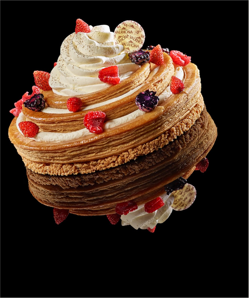 这道超新颖的甜品富含双重趣味:一方面它比标准的千层糕更能引起大家的品尝欲望。另一方面,它具有酥脆的口感,并使用平衡的造型来打造轻盈饱满的外观。