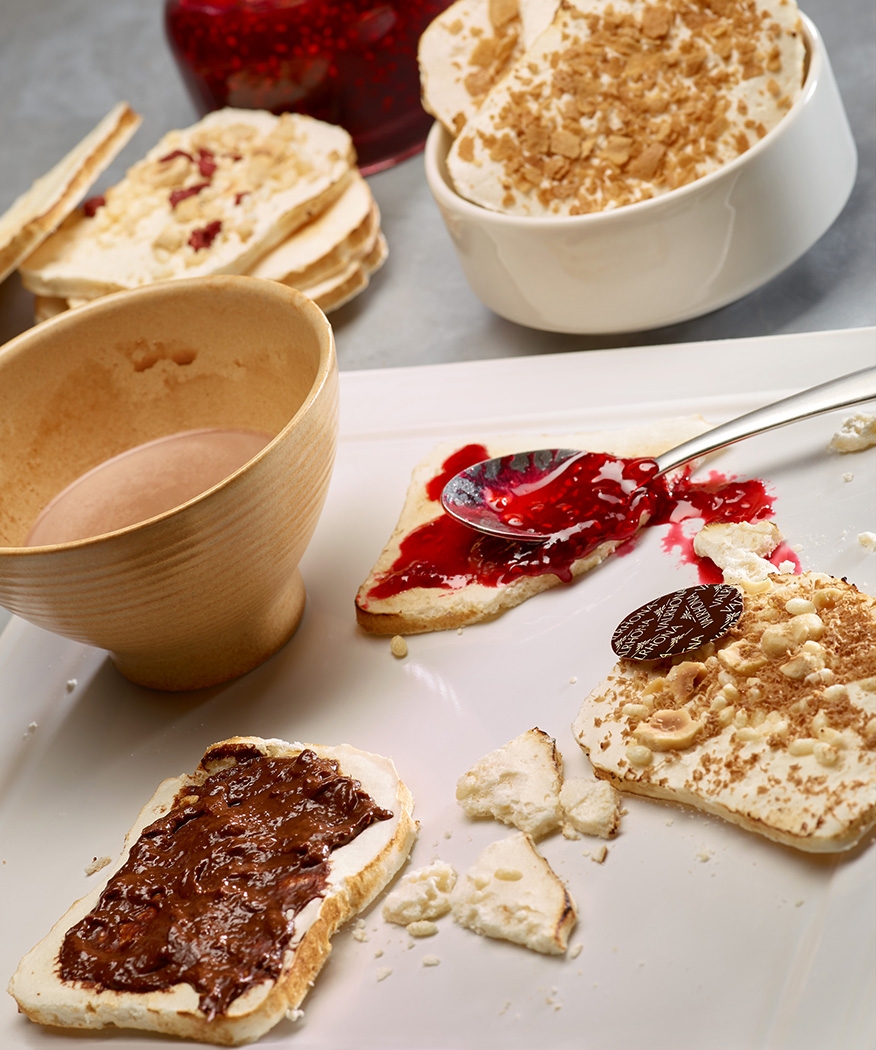 我们的甜品师重温了经典的梅尔巴吐司(又叫法国小面包),搭配优质的法国蛋白霜抹酱。这只是个小把戏。您只需剪出一个模板,然后就可以将您的蛋白霜变成小梅尔巴吐司的形状。您可以再搭配一小罐手工制作的八角茴香覆盆子果酱,或者60%榛果巧克力酱。